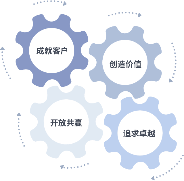 成就客户是一切决策的出发点,,,,创造价值是衡量所有工作的标准,,,追求卓越是我们做事做人的态度,,,,开放共赢是我们的格局也是最终的结果。。。价值观的齿轮环环相扣,,推动着组织里的每个人不断向前。。。。